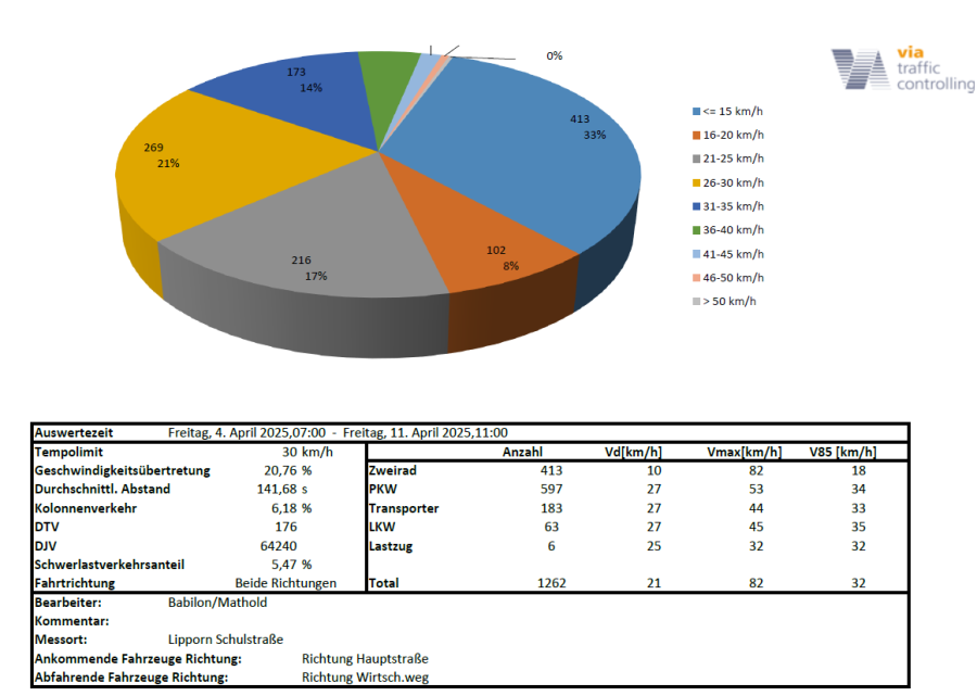 vom 04. April bis 11. April 2025 wurde durch die Verbandsgemeindeverwaltung in Nastätten eine Geschwindigkeitsmessung in der Schulstraße durchgeführt.