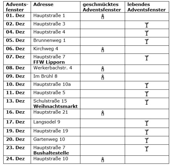 dieses Jahr gibt es in Lipporn auch wieder die Möglichkeit am lebenden Adventskalender / Adventsfenster teilzunehmen. Hier die Erläuterung was der lebende Adventskalender ist: