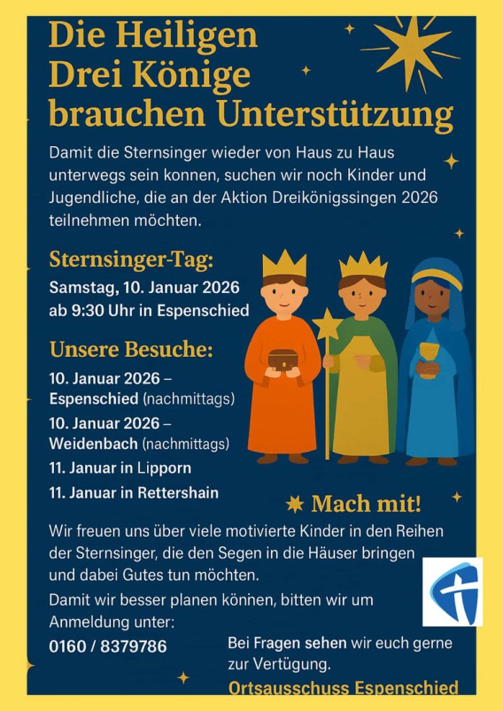 Habt Ihr Lust Anfang Januar 2026 (aktuell ist für Lipporn der 11.01.2026 angedacht ab ca. 14:00 Uhr) bei der Sternsingeraktion teilzunehmen? Dann meldet Euch bitte zeitnah unter unten angegebener Handynummer bei Uwe Peter Tönges-Friedmann (0160-8379786) oder auch gerne telefonisch bei mir (06775-9687687).