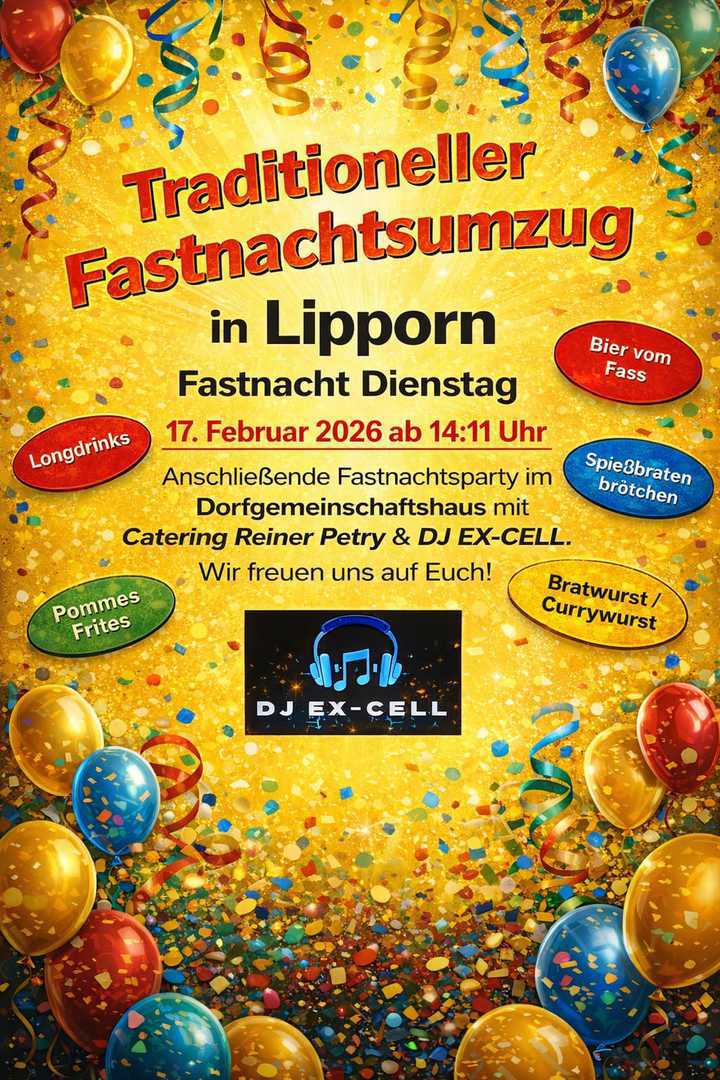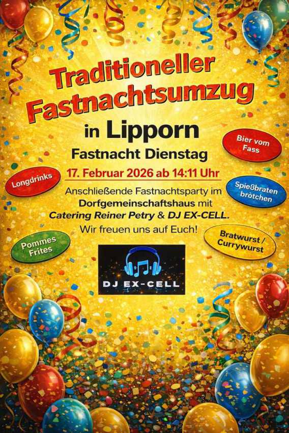 "Kaum zu glauben aber wahr, bunt und närrisch seit 40 Jahr´!" Getreu nach diesem Motto gibt es am Fastnachtsdienstag wieder unseren traditionellen Fastnachtsumzug mit anschließender Fastnachtsparty im Dorfgemeinschaftshaus mit unserem neuen DJ Ex-Cell und unserem Veranstalter Reiner Petry! Wie jedes Jahr nehmen verschiedene Gruppen aus der Vogtei, Espenschied, Dachsenhausen, Ransel teil und natürlich unsere Lipporner Traditions-Gruppen haben sich bereits angemeldet. Das gibt wieder eine riesen Party!